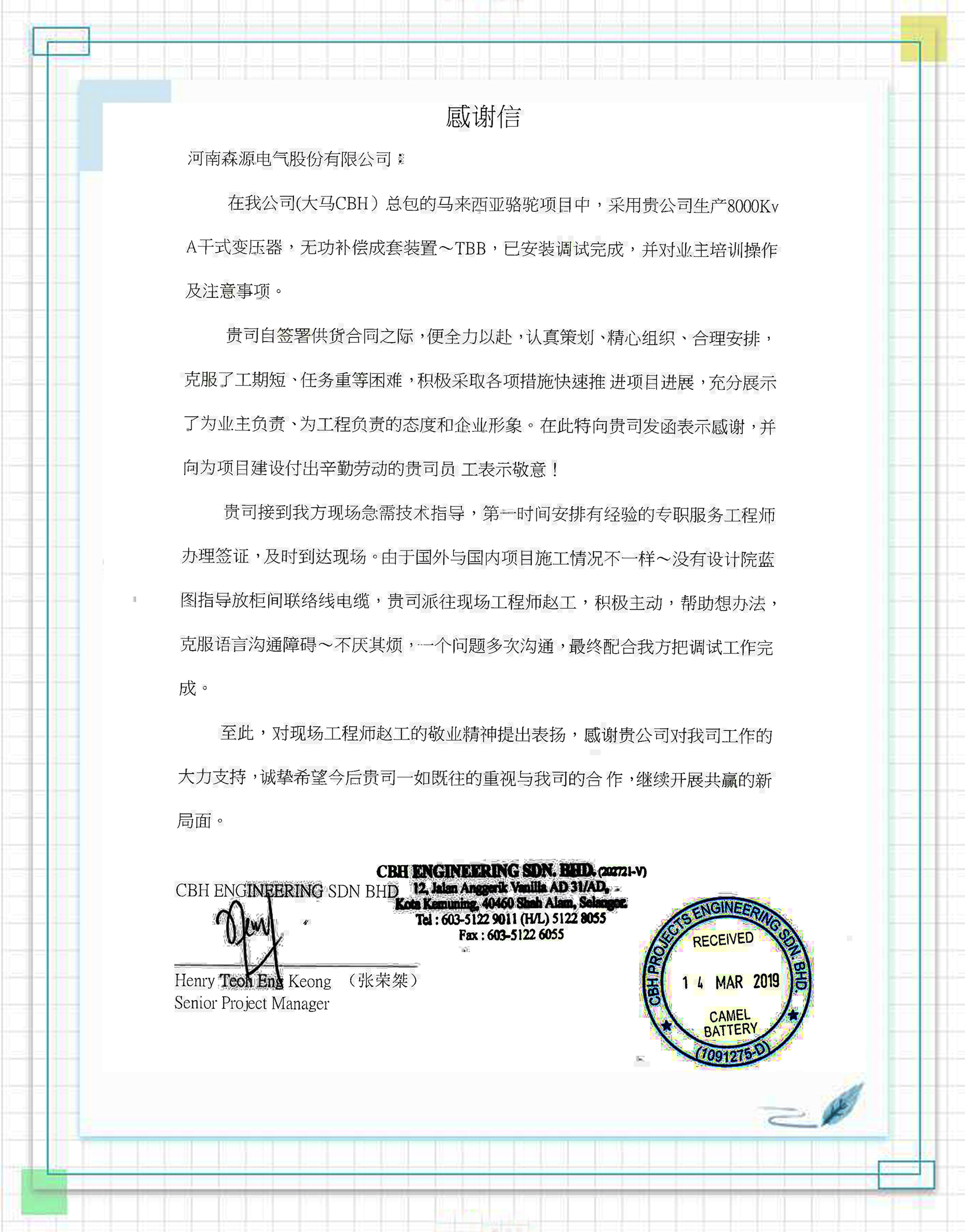 ????? 近日,一封來自馬來西亞大馬CBH公司的感謝信漂洋過海傳到森源電氣,森源提供的卓越產(chǎn)品和一流服務(wù)贏得了他們由衷的贊譽(yù)。